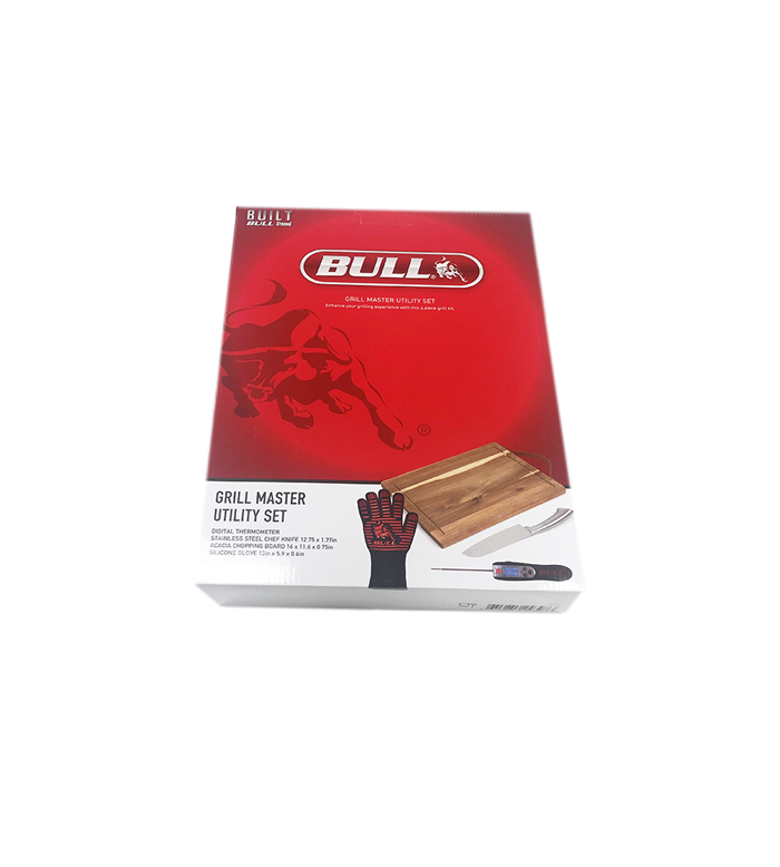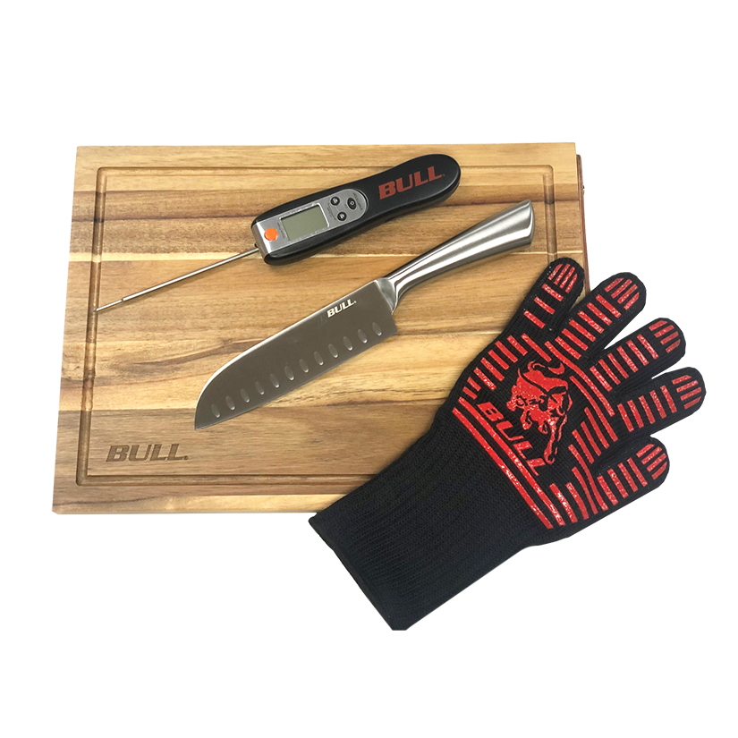 Enhance your grilling experience with this four piece grill set which includes a hardwood cutting board, stainless-steel santoku knife, silicone grill glove, and a digital thermometer. The Bull Grill Master Utility set makes the perfect gift for the griller in you life.