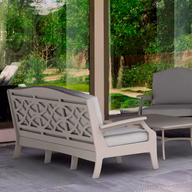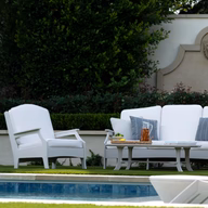 The Legacy Sofa is a luxurious outdoor piece designed to seat three adults comfortably, combining deep seating, plush cushions, and elegant durability. The frame is built from high-density UV-stable resin which holds up well against long sun exposure without fading or warping. The cushions have marine-grade outdoor fabric and EZ-Dri foam cores that help water drain and dry quickly, and they are secured with a strap and buckle system to prevent shifting.