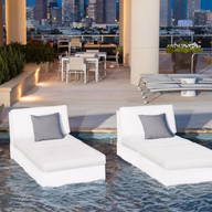 A two-piece luxury sun chair set (middle + ottoman), weather-resistant and usable up to 10″ of water or on deck. Customizable colors, built for comfort and durability outdoors.
